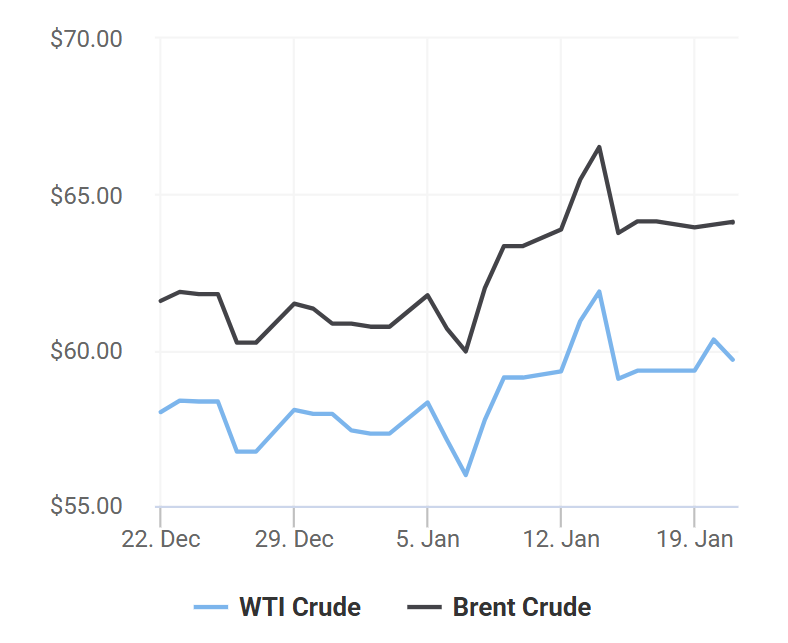Ngày 20/1, cả hai loại dầu thô trên đều tăng khoảng 1,5% trước thông tin hai mỏ dầu Tengiz và Korolev của Kazakhstan buộc phải tạm thời ngừng hoạt động từ 7 đến 10 ngày do các sự cố về phân phối điện.
