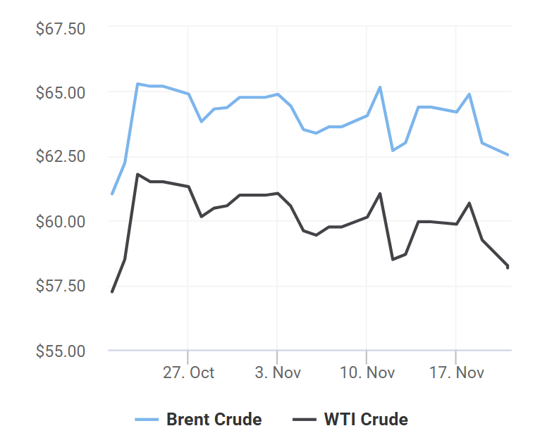 Mỹ yêu cầu Ukraine chấp thuận một khung giải pháp do Mỹ soạn thảo để chấm dứt xung đột với Nga. Diễn biến này khiến thị trường nghi vấn liệu các lệnh trừng phạt của Mỹ đối với hai tập đoàn dầu khí lớn của Nga (Rosneft và Lukoil) có được áp dụng đúng hạn vào ngày 21/11 (theo giờ địa phương) hay không. Theo một số chuyên gia, nếu tiến trình trên có tiến triển, các lệnh này có thể được trì hoãn hoặc dỡ bỏ.