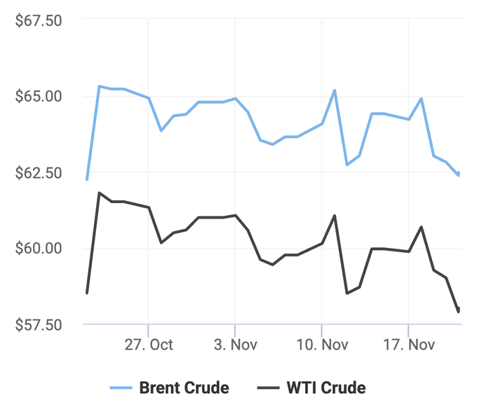 Giá xăng dầu hôm nay 21/11 trên thị trường tiếp tục giảm, theo số liệu từ các sàn giao dịch dầu thô như Trading Economics và Oilprice.