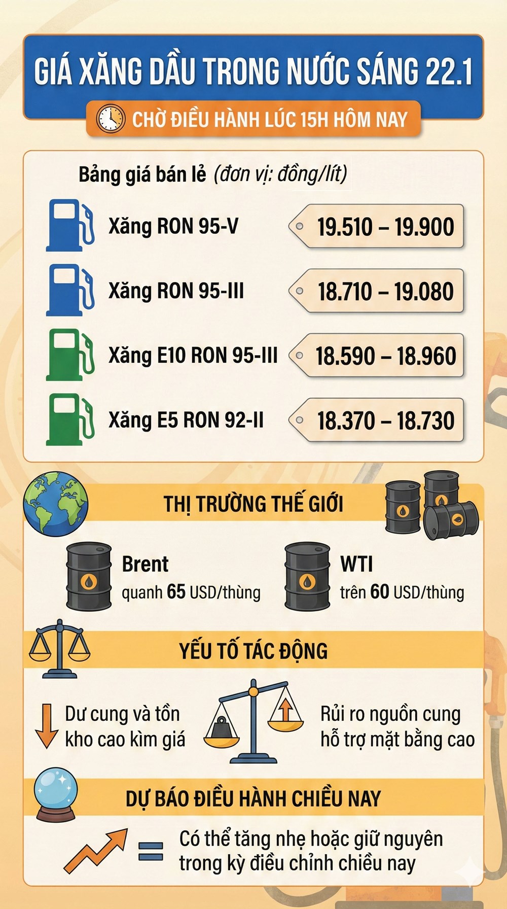 Sáng 22.1.2026, giá bán lẻ xăng dầu trong nước vẫn được duy trì theo mức đã áp dụng từ kỳ điều hành ngày 15.1. Thị trường đang bước vào thời điểm “nén lực”, khi toàn bộ sự chú ý dồn về mốc 15h chiều nay – thời điểm cơ quan quản lý công bố giá bán lẻ mới.