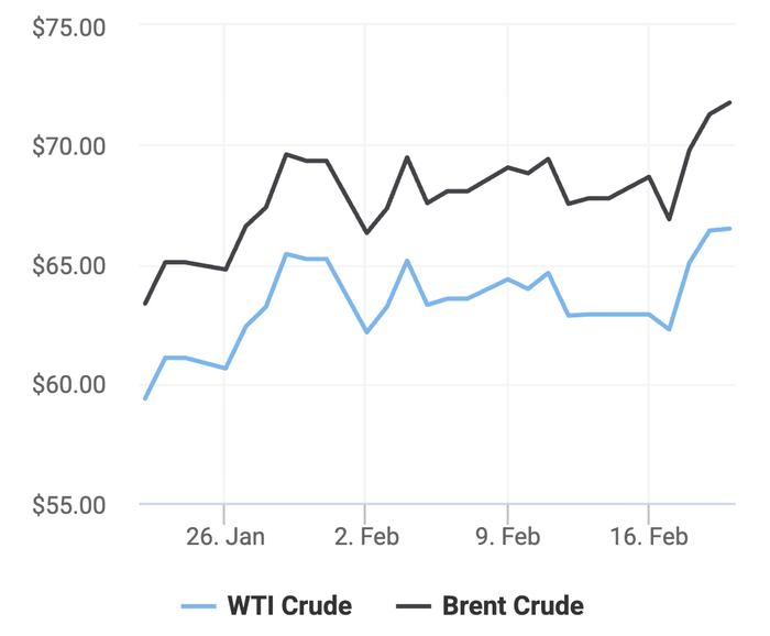 Giá xăng dầu hôm nay 22/2 trên thị trường thế giới bất ngờ tăng trở lại, theo số liệu từ các sàn giao dịch dầu thô như Trading Economics và Oilprice.