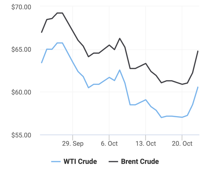 Giá xăng dầu hôm nay 23/10 trên thị trường thế giới tăng mạnh, theo số liệu từ các sàn giao dịch dầu thô như Trading Economics và Oilprice.
