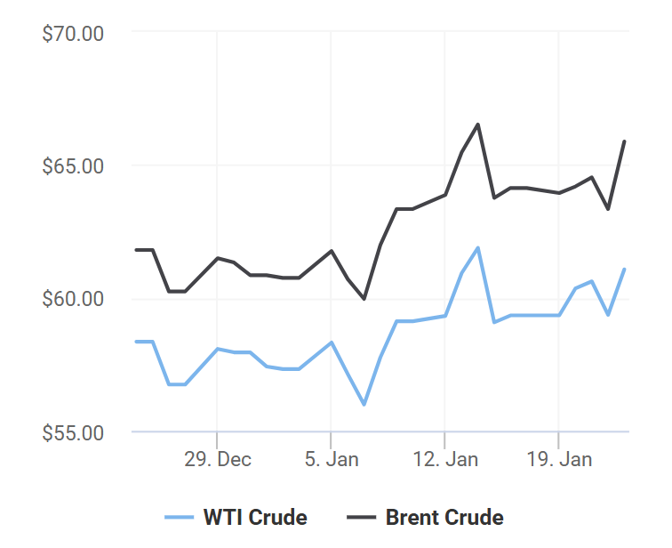 Cụ thể, vào lúc 9h00 (theo giờ Việt Nam), giá dầu thô Brent đạt 65,88 USD/thùng và giá dầu thô ngọt nhẹ Texas (WTI) đạt 61,07 USD/thùng. Chốt phiên giao dịch ngày hôm qua, cả giá dầu thô Brent và giá dầu thô WTI đều tăng gần 3%.