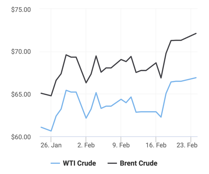 Tính đến hôm nay 24/2, bình quân giá dầu thô tháng 2 tăng từ 8,8% - 9,3% so với giá bình quân tháng trước. Trong khi đó so với cùng kỳ năm trước, giá dầu thô thế giới suy giảm từ 4,5% đến trên 6,2%.