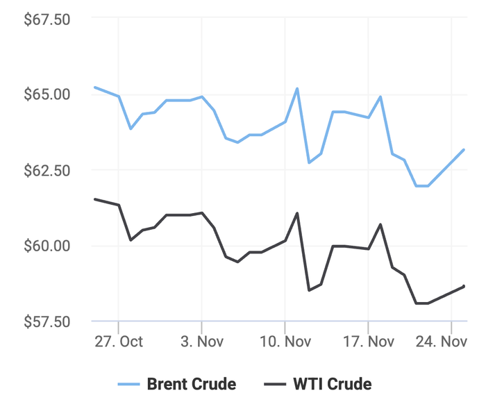 Giá xăng dầu hôm nay 25/11 trên thế giới bất ngờ bật tăng mạnh sau chuỗi ngày giảm liên tục, theo số liệu từ các sàn giao dịch dầu thô như Trading Economics và Oilprice.