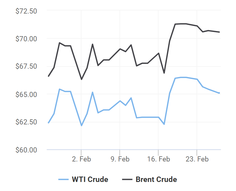 Số liệu thống kê cho thấy, tính đến ngày 27/2, bình quân giá dầu thô tháng 2 tăng 4,9% so với tháng trước. Trong khi đó so với cùng kỳ năm trước, giá dầu thô thế giới giảm từ 3,6% đến trên 6,9%. Giới đầu tư đang hướng đến cuộc họp của Tổ chức các nước xuất khẩu dầu mỏ và đồng minh (OPEC+) vào cuối tuần này để xác định lộ trình sản lượng cho tháng 4.
