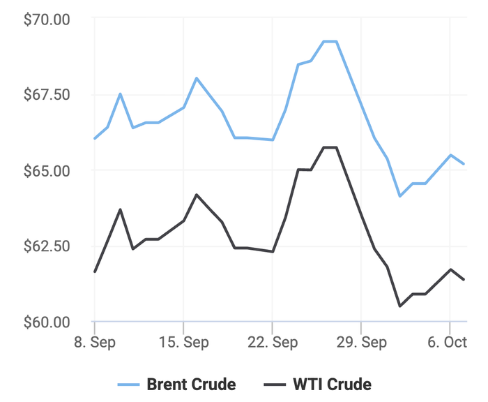Cụ thể, giá dầu WTI giao ngay bán ra ở ngưỡng 61,7 USD/thùng, tăng 0,81 USD/thùng, mức tăng 1,34% so với ngày hôm qua. Dầu thô Brent ngọt nhẹ giao dịch ở mức 65,48 USD/thùng, tăng 0,95 USD/thùng, mức tăng 1,48% về giá so với ngày hôm qua.
