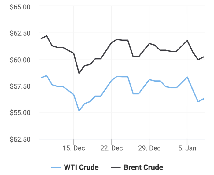 Cụ thể, dầu WTI giao ngay bán ra gần 56,3 USD/thùng, tăng nhẹ 0,35 USD/thùng, tương đương mức tăng 0,63% về giá so với ngày hôm qua. Giá dầu thô Brent ngọt nhẹ giao dịch ở mức 60,3 USD/thùng, giảm 0,4 USD/thùng, tương đương mức giảm 0,65% về giá so với ngày hôm qua.