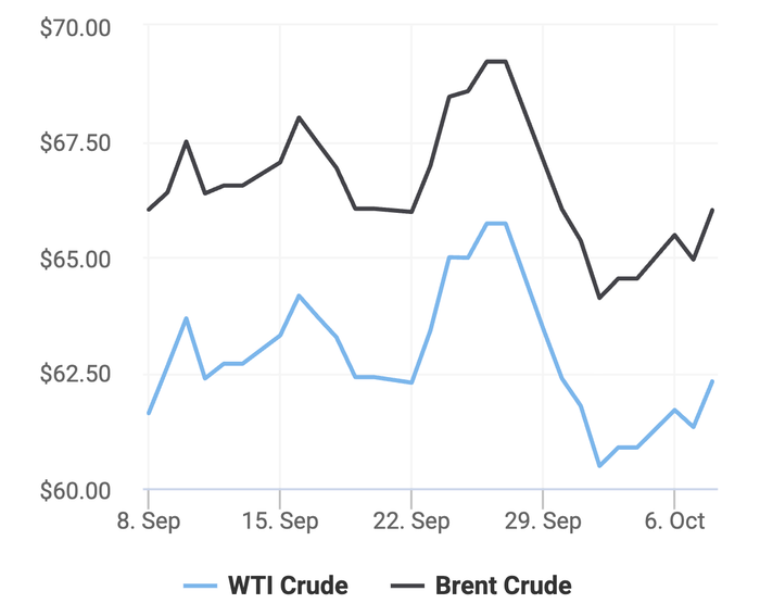 Cụ thể, giá dầu WTI giao ngay bán ra ở ngưỡng 62,1 USD/thùng, tăng 0,45 USD/thùng, mức tăng 0,7% so với ngày hôm qua. Dầu thô Brent ngọt nhẹ giao dịch ở mức 65,8 USD/thùng, tăng 0,34 USD/thùng, mức tăng 0,52% về giá so với ngày hôm qua.