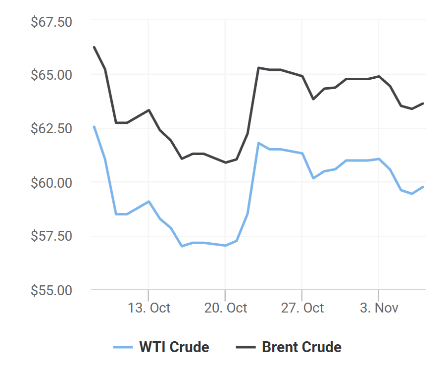 Xu hướng giá dầu thô Brent và giá dầu thô WTI trong 30 ngày gần đây. (Nguồn: Oil Price)