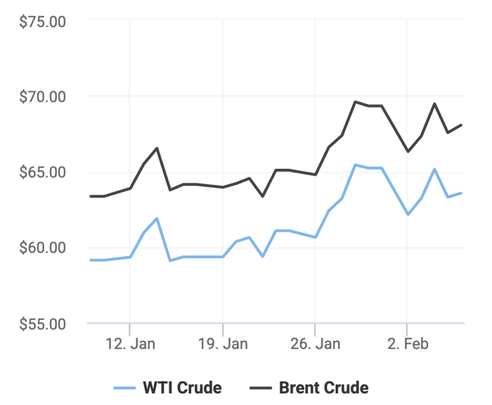 Giá xăng dầu hôm nay 8/2 trên thị trường thế giới tiếp tục tăng nhẹ so với phiên giao dịch ngày hôm qua, theo số liệu từ các sàn giao dịch dầu thô như Trading Economics và Oilprice.