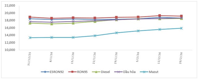 Biến động giá bán xăng dầu trong nước năm 2026 (31/12/2025 đến 20/02/2026)
