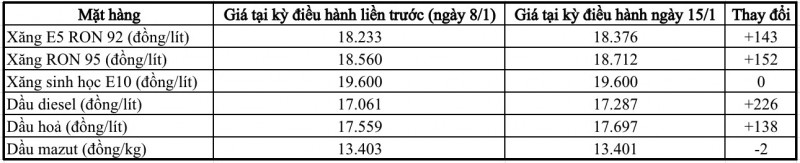 Bình quân giá thành phẩm xăng dầu thế giới giữa kỳ điều hành giá ngày 8/1/2026 và kỳ điều hành ngày 15/1/2026 là: 71,57 USD/thùng xăng RON 92, tăng 0,71 USD/thùng; 72,79 USD/thùng xăng RON 95, tăng 0,61 USD/thùng; 81,96 USD/thùng dầu hỏa, tăng 0,82 USD/thùng; 80,03 USD/thùng dầu diesel, tăng 1,18 USD/thùng; 346,11 USD/tấn dầu mazut, tăng 4,76 USD/tấn.