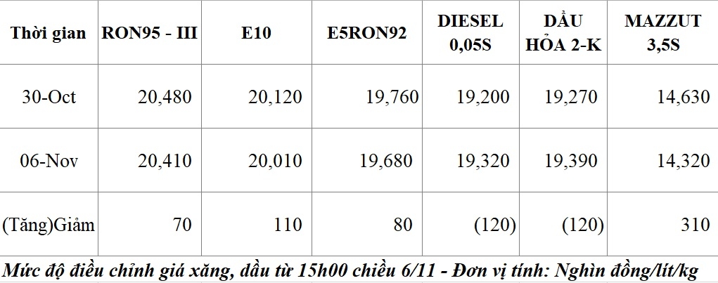 Giá xăng dầu mới được liên Bộ Công Thương - Tài chính thông báo điều chỉnh từ 15h00 chiều nay (6/11). Giá xăng RON95-III là 20.410 đồng/lít, giảm 70 đồng/lít; giá xăng E10 là 20.010 đồng/lít, giảm 110 đồng/lít; giá xăng E5RON92 là 19.320 đồng/lít, giảm 80 đồng/lít.