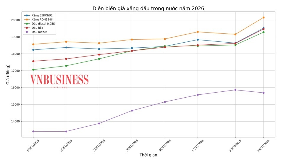 Theo số liệu bình quân giữa kỳ điều hành giá ngày 20/2 và 26/2, giá thành phẩm xăng dầu trên thị trường thế giới ghi nhận xu hướng tăng ở hầu hết các mặt hàng chủ chốt. Cụ thể, xăng RON92 dùng để pha chế xăng E5RON92 đạt mức 78,238 USD/thùng (tăng 6,34%); giá xăng RON95 ở mức 80,628 USD/thùng (tăng 6,47%); dầu hỏa đạt 92,405 USD/thùng (tăng 5,12%); dầu diesel 0,05S ở mức 91,673 USD/thùng (tăng 4,46%); dầu mazut 180CST 3,5S ghi nhận xu hướng giảm, bình quân ở mức 427,860 USD/tấn, giảm 1,79%.