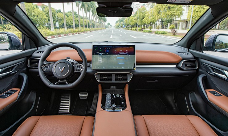 Khoang cabin của VF 8 được thiết kế theo phong cách tối giản, loại bỏ bảng đồng hồ truyền thống phía sau vô-lăng để thay thế bằng màn hình hiển thị thông tin trên kính lái (HUD). Trung tâm táp-lô là màn hình cảm ứng 15,6 inch tích hợp mọi tính năng điều khiển và giải trí.
