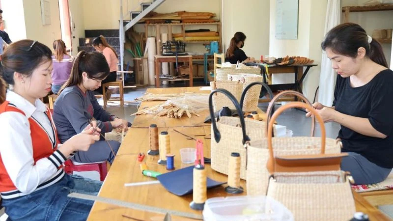 Những người thợ của Công ty TNHH Đan Việt Handicraft, xã Ba Đình miệt mài các công đoạn làm túi thủ công.