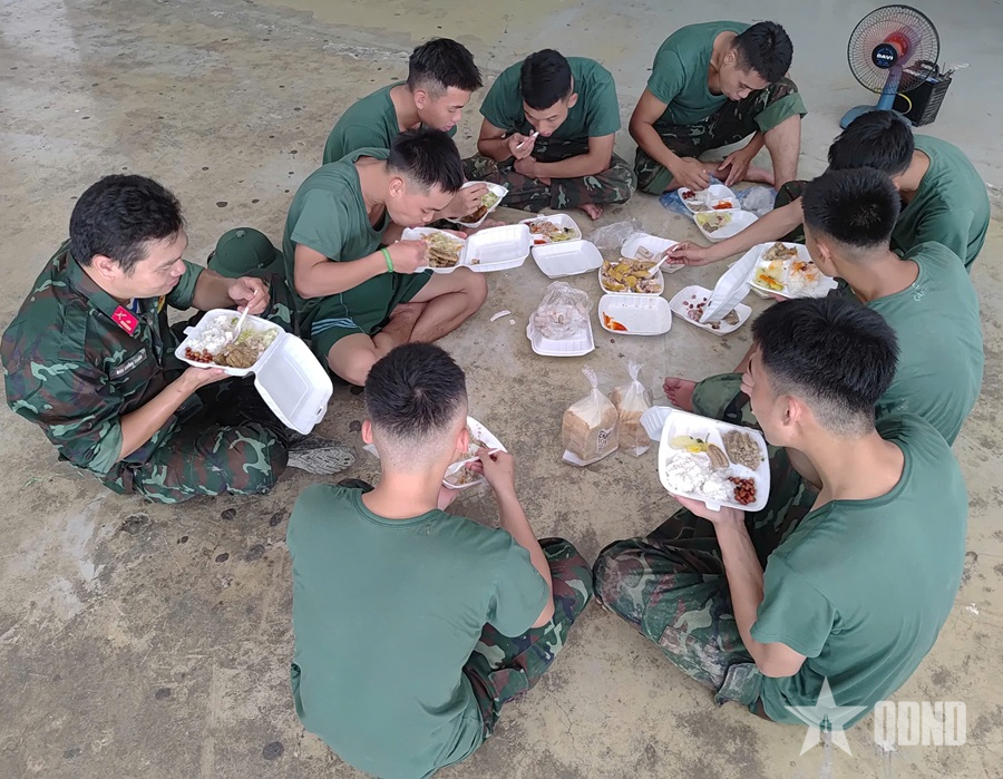 Bữa cơm trưa của bộ đội Tiểu đoàn Chỉ huy Pháo binh 13 tại chợ Thái. Thương cán bộ, chiến sĩ lao động vất vả, Ban Quản lý chợ Thái mua thêm đồ ăn tặng bộ đội, tiểu thương cho mượn quạt...