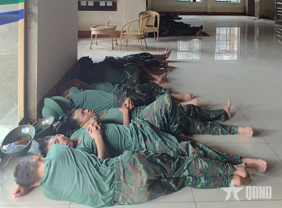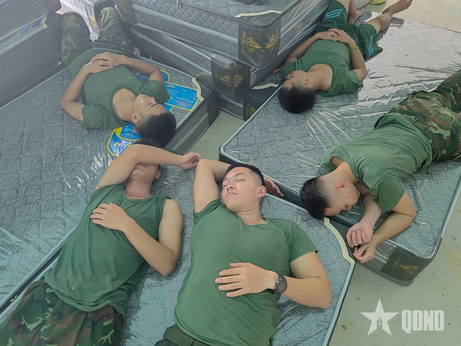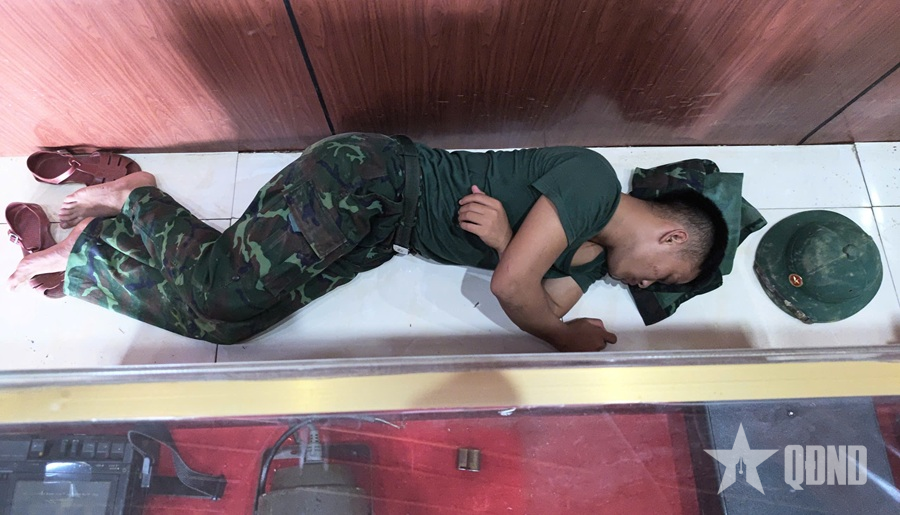 Lao động nhiều giờ trong điều kiện khắc nghiệt khiến cán bộ, chiến sĩ đều mệt. Vì vậy, bộ đội tận dụng mọi chỗ có thể để chợp mắt.