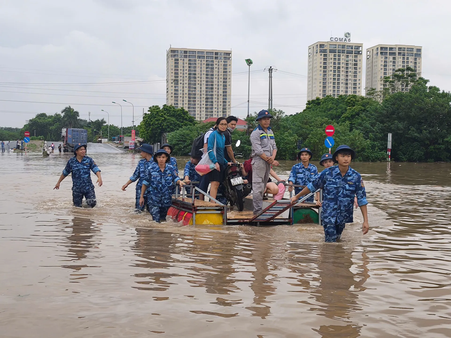 Lực lượng chức năng hỗ trợ người dân đi qua vùng ngập nước khu vực Đại Lộ Thăng Long, Hà Nội sáng 1/10. Ảnh: Phạm Hùng