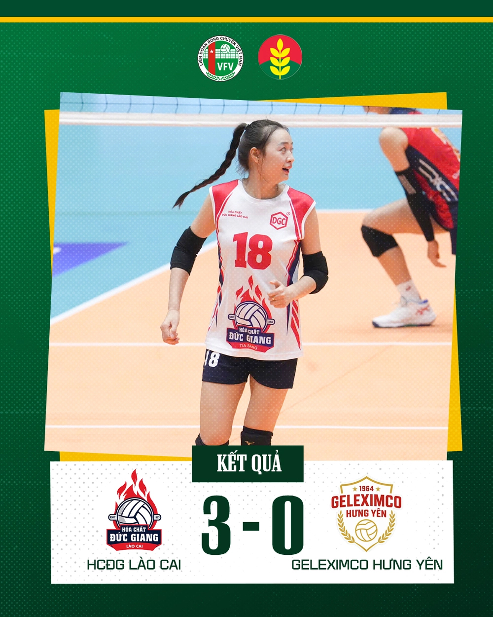 Đội bóng đến từ Lào Cai thi đấu vượt trội, liên tục tạo khoảng cách điểm số lớn và không cho đối thủ cơ hội lật ngược tình thế. Kết quả, Hóa chất Đức Giang Lào Cai giành chiến thắng tuyệt đối 3-0 với các tỷ số cách biệt 25-15, 25-12 và 25-10, qua đó có màn ra quân không thể ấn tượng hơn.