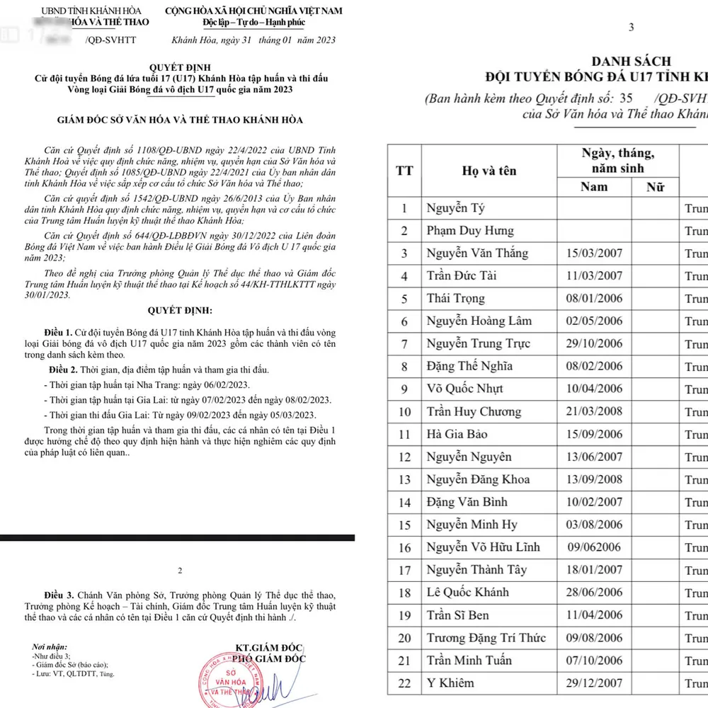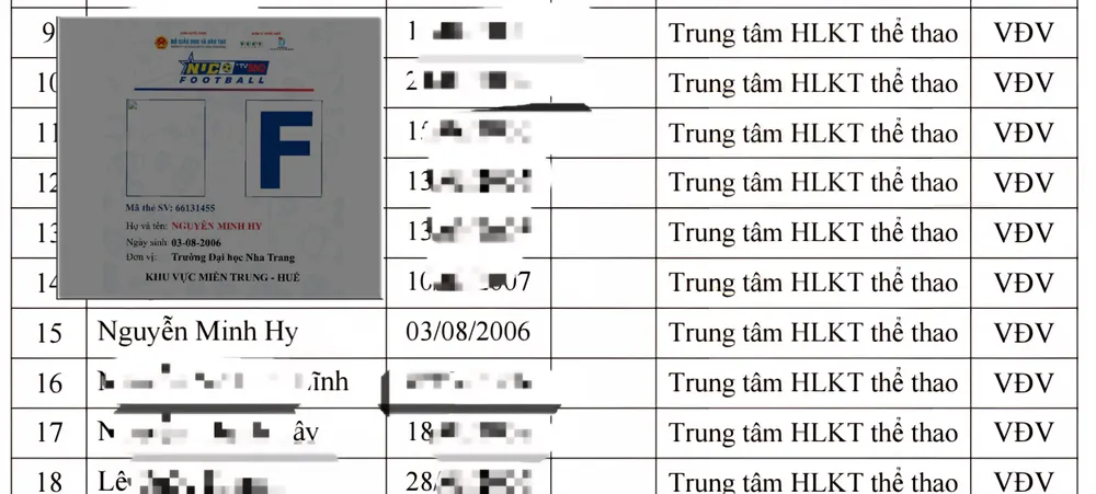 Nguyễn Minh Hy từ Đơn vị Trường Đại học Nha Trang (ảnh nhỏ) bị tố đã được Sở Văn hóa và Thể thao Khánh Hòa cử tham gia đội tuyển Bóng đá U-17 Khánh Hòa tập huấn và thi đấu Vòng loại Giải bóng đá vô địch U-17 quốc gia năm 2023 (ảnh lớn).