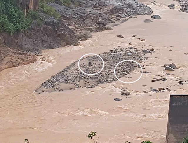 Hai người bị kẹt giữ dòng nước lũ cuồn cuộn.