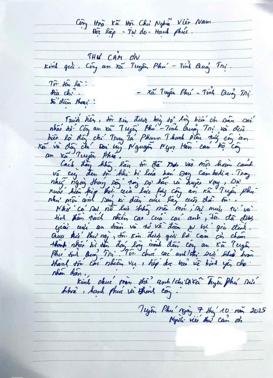 Những ngày đầu tháng 10/2025, tại trụ sở Công an xã Tuyên Phú (tỉnh Quảng Trị), một cô gái trẻ lặng lẽ trao bức thư viết tay cho các chiến sĩ công an. Trong thư, cô bày tỏ lòng biết ơn sâu sắc với những người đã cứu mạng mình, những người đã đưa cô trở về từ “khu tự trị” ở Campuchia, nơi cô từng nghĩ rằng mình sẽ không bao giờ còn được thấy quê hương.