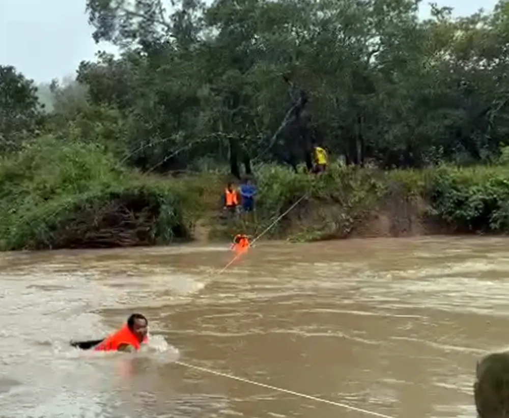 Các thành viên cứu hộ bơi qua sông.