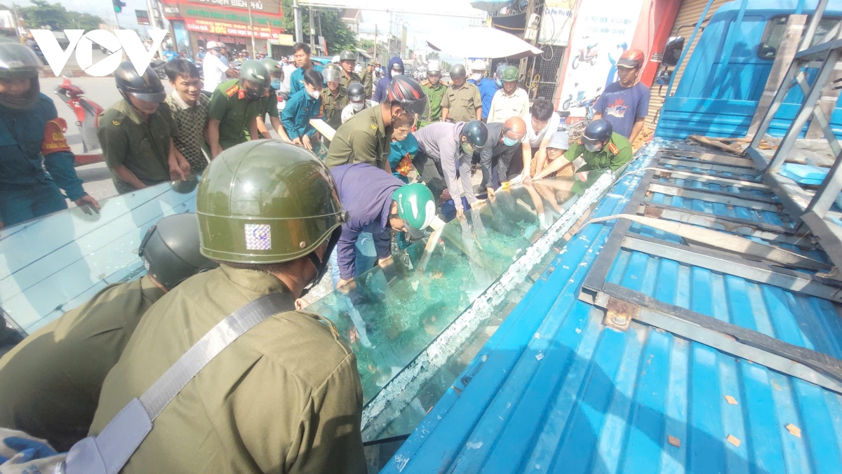 Tai nạn này khiến cả hai nạn nhân bị thương nặng, nằm bất động. Ngay khi phát hiện sự việc, Công an xã Bình Đức cùng người dân và lực lượng tại chỗ nhanh chóng có mặt, phối hợp di dời từng tấm kính kích để đưa hai nạn nhân ra ngoài.