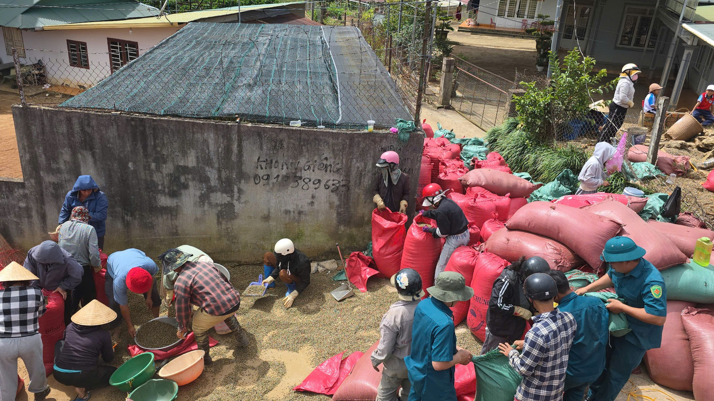 Người dân xã Phú Sơn Lâm Hà hỗ trợ hốt cà phê. Ảnh: PN.