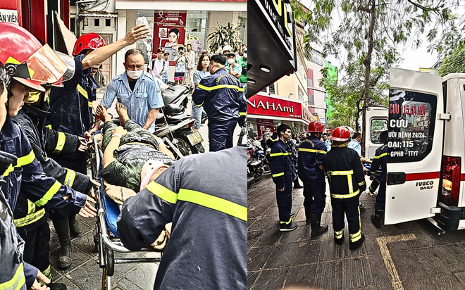 Nam thanh niên mắc kẹt trong thang máy chở hàng tại phố Trần Đại Nghĩa được lực lượng cứu nạn cứu hộ Hà Nội giải cứu, sơ cứu tại chỗ và chuyển lên xe cứu thương an toàn.