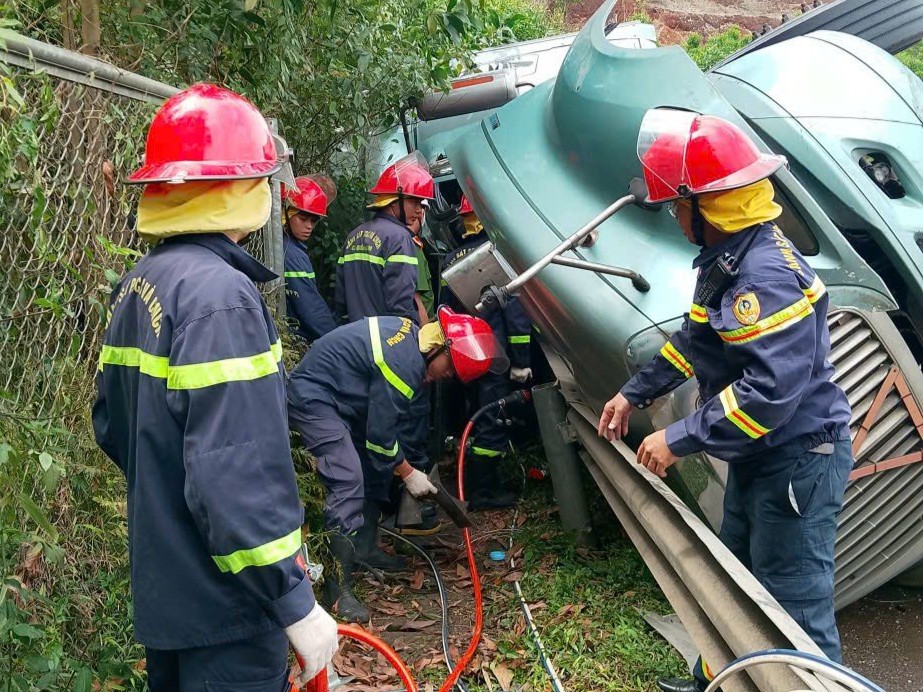 Ngay sau khi tiếp nhận tin báo, đơn vị đã điều động 1 xe chỉ huy, 1 xe cứu nạn cứu hộ, 1 xe chữa cháy cùng cán bộ, chiến sĩ nhanh chóng đến hiện trường triển khai công tác cứu nạn. Tại hiện trường, cửa cabin bị kẹt cứng, nhiều cấu kiện kim loại chèn ép khiến tài xế mắc kẹt trong không gian hẹp.