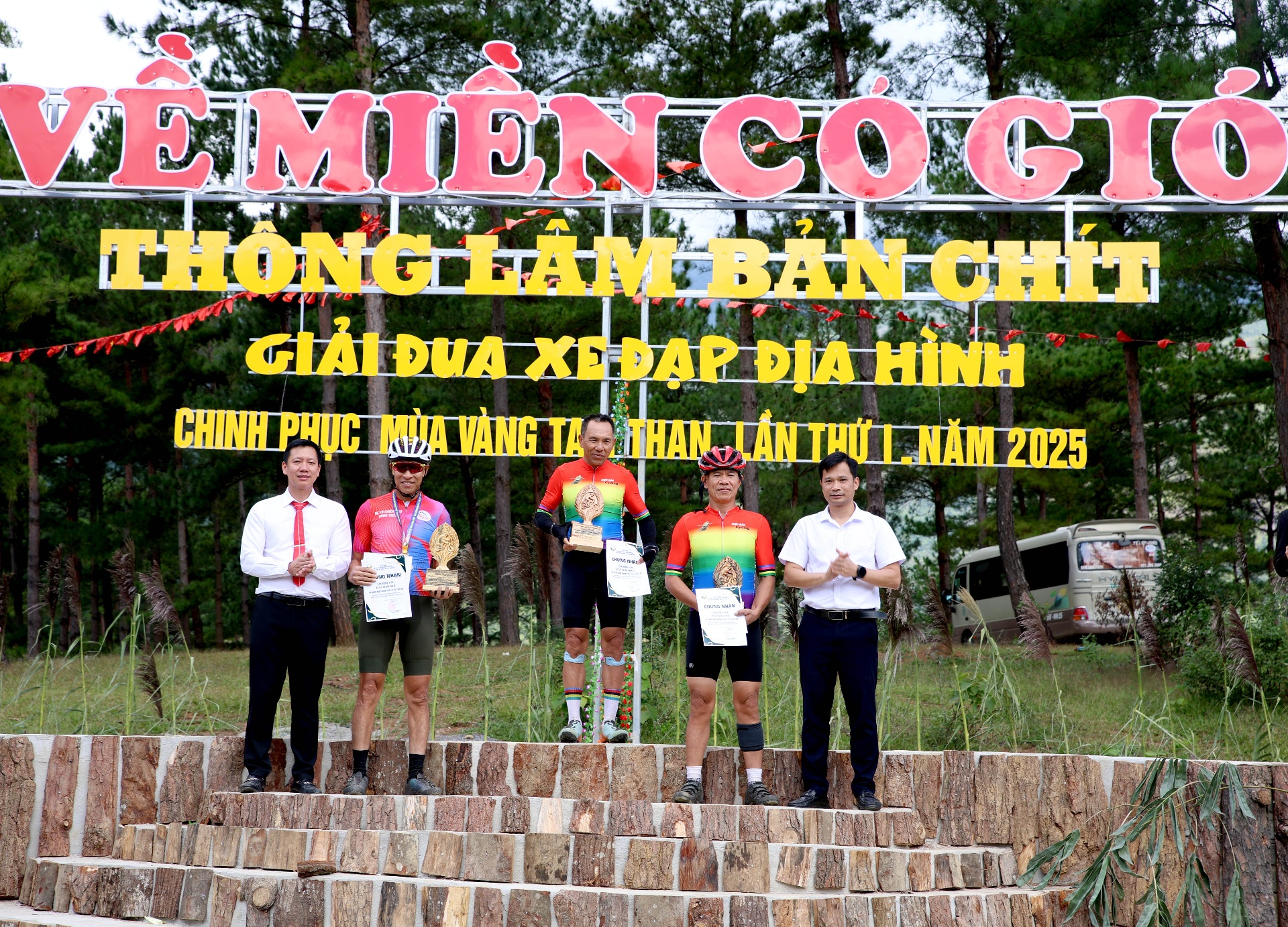 Lãnh đạo Sở Văn hóa, Thể thao và Du lịch Lai Châu và UBND xã Mường Than trao giải cho các vận động viên nam nhóm cao tuổi.
