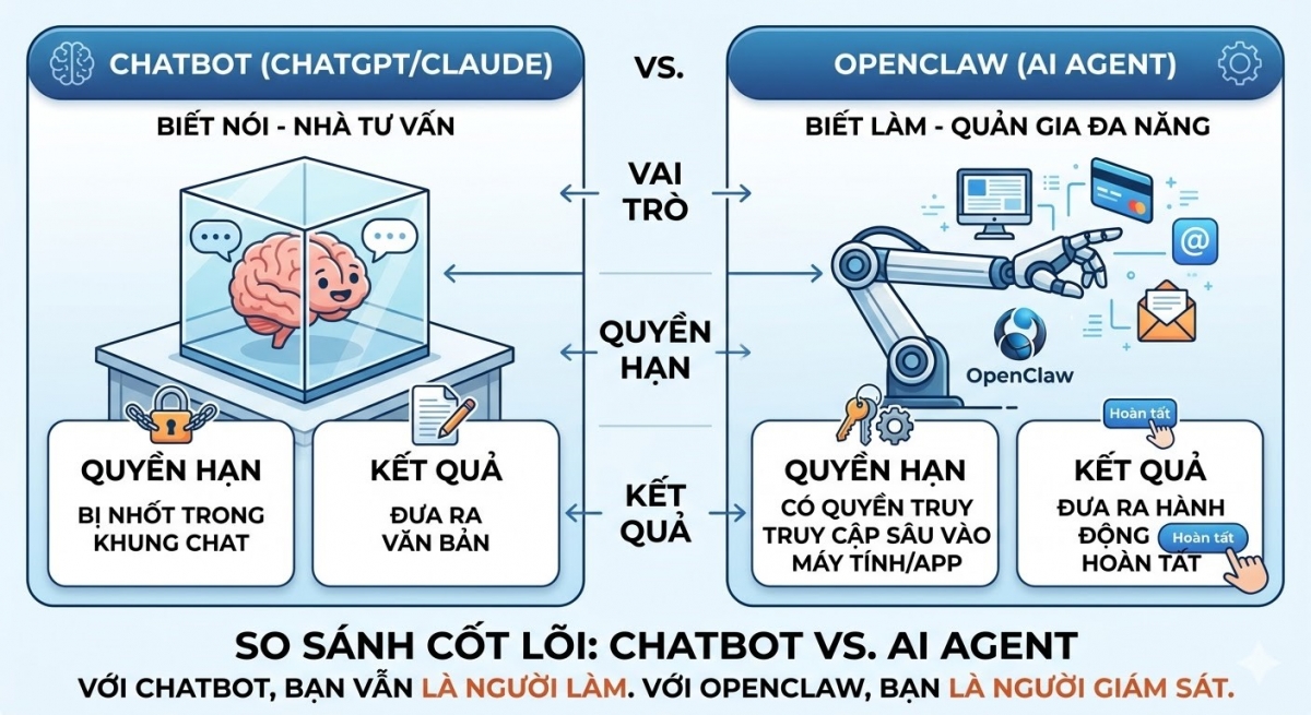 Nếu ChatGPT là một "giáo sư" ngồi trong phòng kính chỉ biết trả lời câu hỏi, thì OpenClaw chính là một "quản gia đa năng" có chìa khóa của mọi căn phòng.