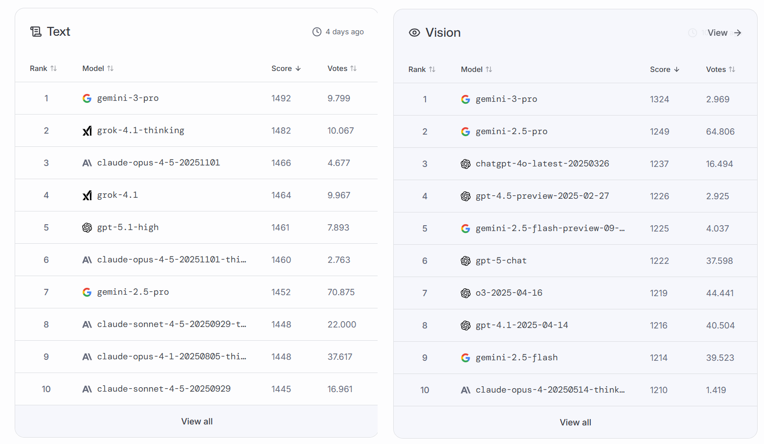 Nổi bật nhất trong nhóm là sự bứt phá của Google với Gemini 3.0. Từ vị thế từng bị xem là “ gã khổng lồ chậm nhịp”, Google tận dụng lợi thế hạ tầng để lật ngược tình thế. Dựa trên bảng xếp hạng LMArena cập nhật ngày 26.11, Gemini 3.0 Pro của Google đang giữ vị trí dẫn đầu thị trường trong nhiều lĩnh vực cốt lõi.