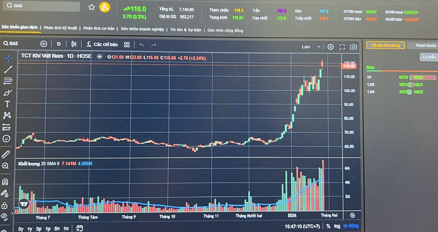 Sau hai phiên tăng trần trước đó, phiên 28/1, GAS tiếp tục tăng thêm 2,34% lên 118.000 đồng/cổ phiếu, thiết lập đỉnh giá mới. Đà tăng trưởng này tiếp tục củng cố chuỗi bứt phá ấn tượng của doanh nghiệp khi giá trị cổ phiếu tăng hơn 60% chỉ trong vòng một tháng, phản ánh kỳ vọng cực lớn của giới đầu tư.