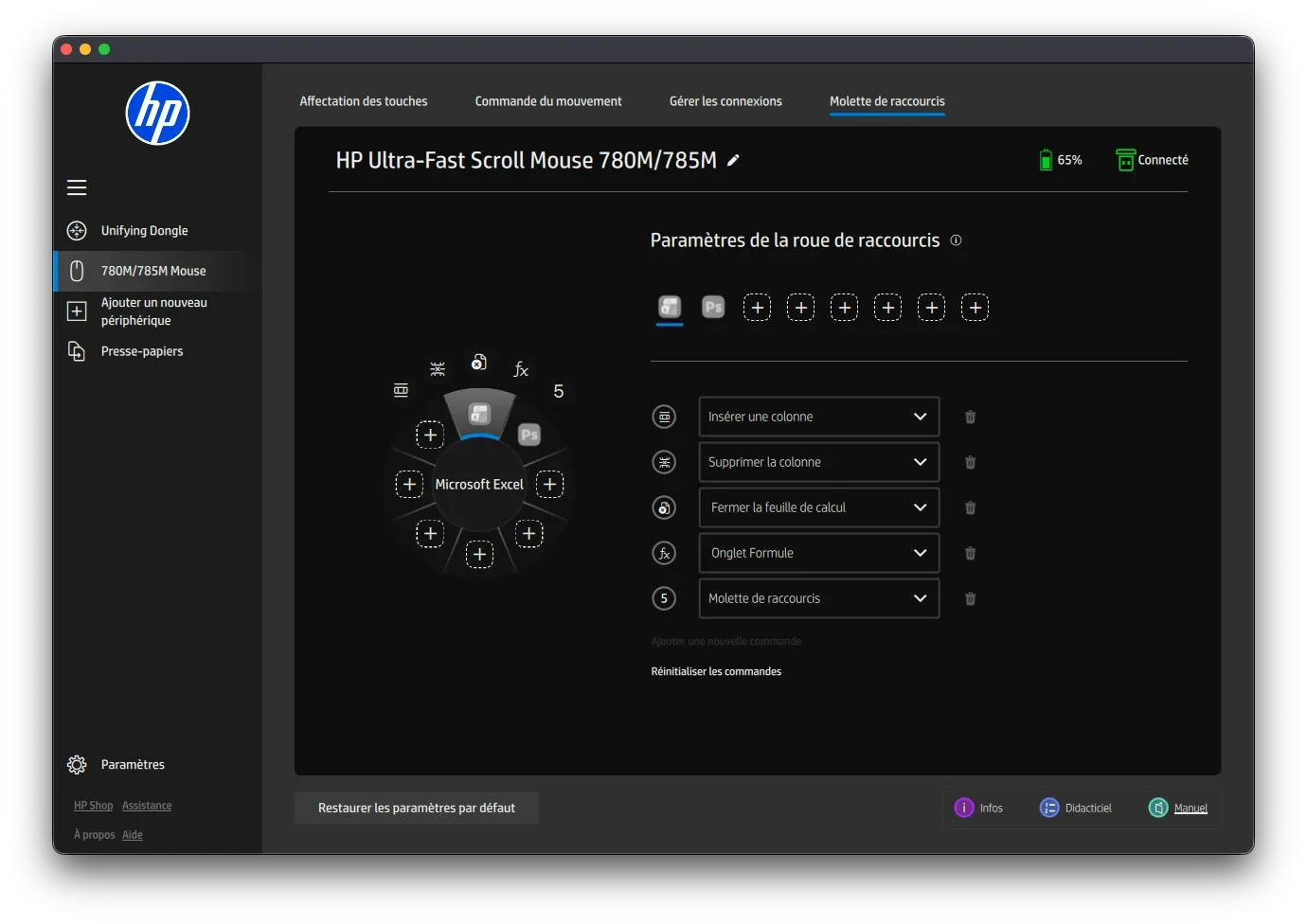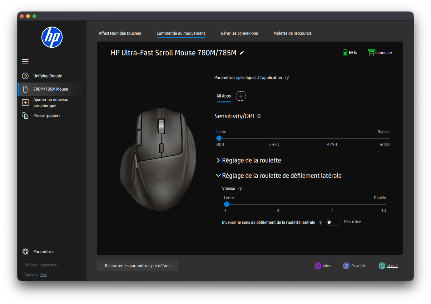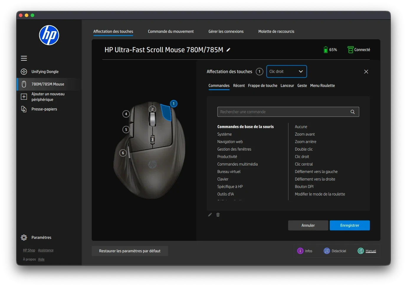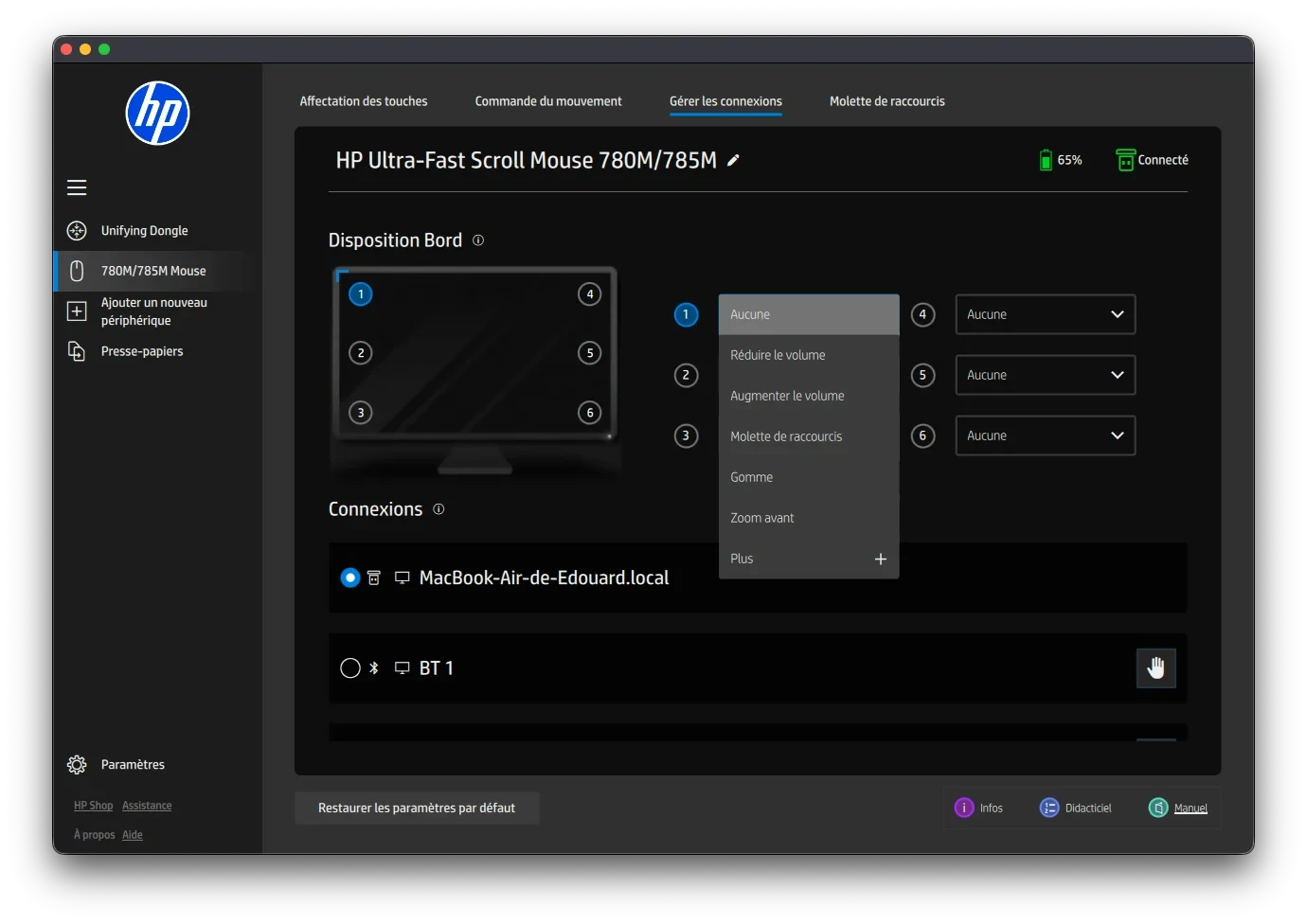 Mẫu chuột này tích hợp sẵn các hành động phụ như giữ hai nút bên để điều chỉnh thu phóng hoặc âm lượng. Để tối ưu hơn, phần mềm HP Accessory Center cho phép tái gán toàn bộ nút bấm theo từng ứng dụng cụ thể.