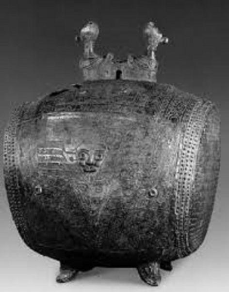 Trống đồng của văn hóa Ngô Thành (thế kỷ 14-13 TCN) là dạng trống đồng mô phỏng hình trống da, trên đỉnh có hình đôi chim cú thể hiện thần đúc đồng và cũng là thần trống đồng. Trên thân trống có khắc hình Ông Tổ Xuy Vưu cũng là thần sấm-thần mưa-thần chiến tranh của người Tam Miêu với mặt người, hai mắt to tròn lồi như mắt cú, đầu có sừng trâu…