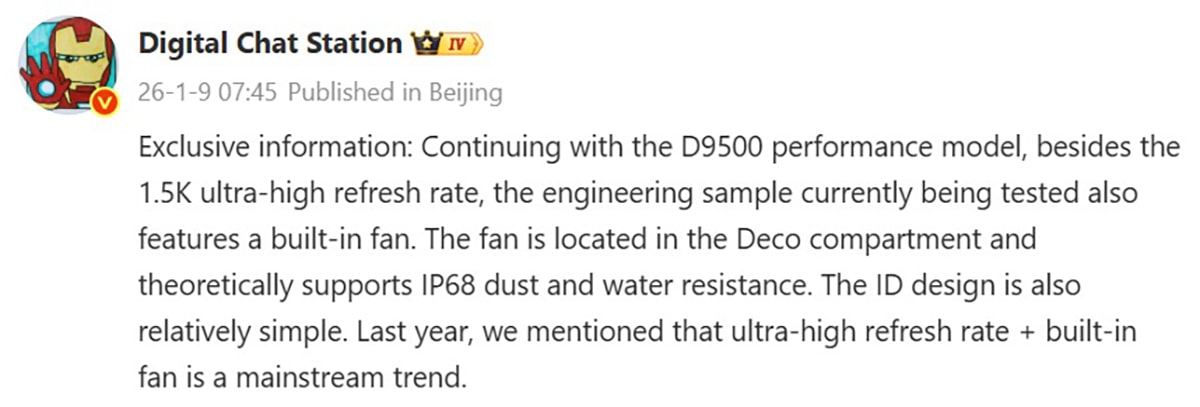 Về sức mạnh bên trong, Redmi K90 Ultra được cho là sẽ sử dụng vi xử lý Dimensity 9500 thay vì phiên bản Plus. Thông tin này trở nên hợp lý khi MediaTek có khả năng không ra mắt biến thể Dimensity 9500 Plus trong năm nay. Tuy nhiên, với sự hỗ trợ từ hệ thống quạt tản nhiệt tích hợp, hiệu suất thực tế của máy vẫn hứa hẹn sẽ rất ấn tượng.
