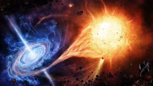 Theo nghiên cứu mới công bố, ngôi sao đã bị cuốn vào lực hấp dẫn của một hệ lỗ đen đôi. Lỗ đen khổng lồ trung tâm đóng vai trò "đao phủ" đầu tiên, xé nát ngôi sao và biến nó thành đĩa bồi tụ. Ngay sau đó, lỗ đen thứ hai, nhỏ hơn nhưng vẫn mang sức mạnh hủy diệt đã lao tới "cắn xé" ngôi sao. Ảnh: Mark Garlick/Science Photo Library/Getty Images.