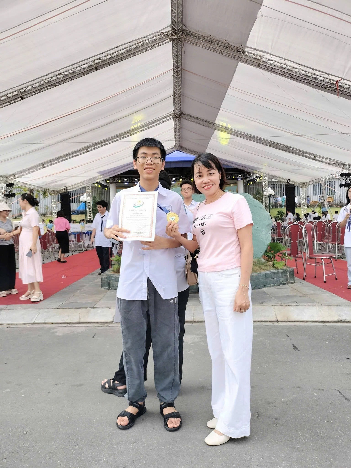 Trần Đức Hiếu cùng cô giáo lãnh đội tại Trại hè Hùng Vương 2025.