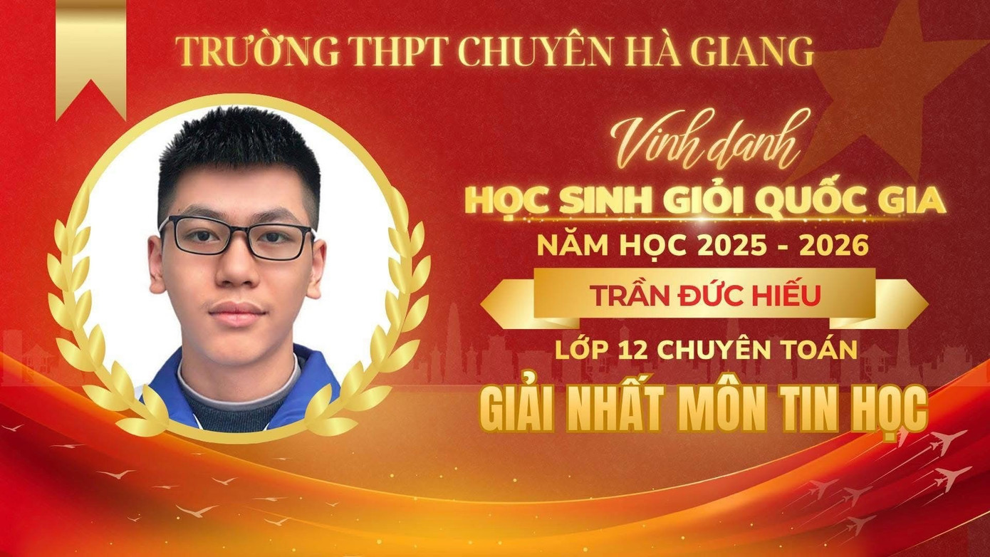 Năm học 2025 - 2026 (Lớp 12): Giải Nhất học sinh giỏi (HSG) Quốc gia môn Tin học (Top 2 toàn quốc); Đạt thứ hạng Grandmaster trên Codeforces; Triệu tập tham dự kỳ thi chọn đội tuyển Olympic quốc tế.