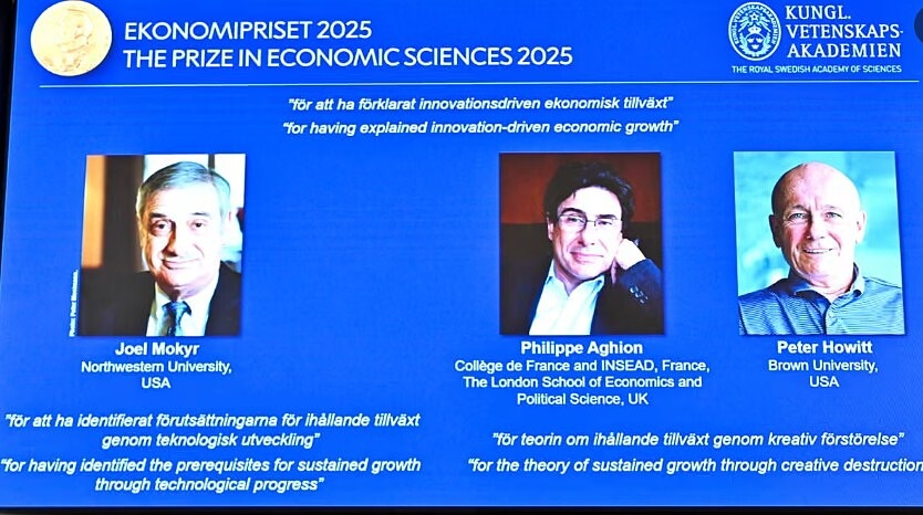 Theo công bố của Viện Hàn lâm Khoa học Hoàng gia Thụy Điển, giải thưởng danh giá năm nay, Giải thưởng Sveriges Riksbank về Khoa học Kinh tế tưởng nhớ Alfred Nobel, được trao cho Joel Mokyr, Philippe Aghion và Peter Howitt “vì đã giải thích được sự tăng trưởng kinh tế do đổi mới thúc đẩy”.