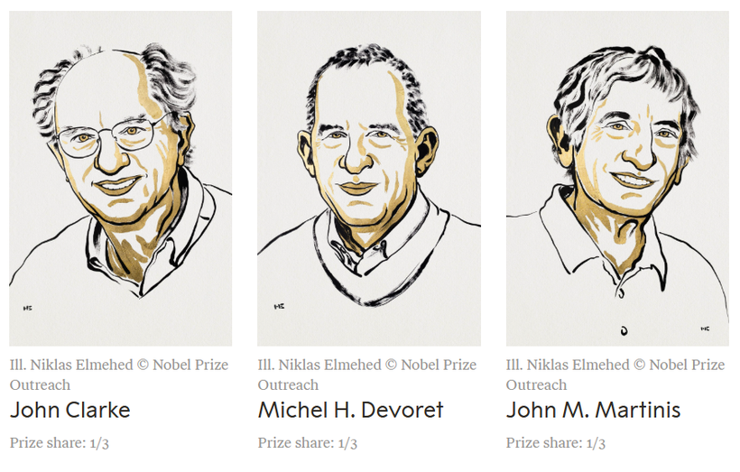 John Clarke, Michel Devoret và John Martinis sẽ cùng chia sẻ giải thưởng “vì đã phát hiện đường hầm cơ học lượng tử ở cấp độ vĩ mô và lượng tử hóa năng lượng trong một mạch điện”, Ủy ban Nobel công bố hôm 7/10 trong buổi lễ tổ chức tại Stockholm, Thụy Điển.