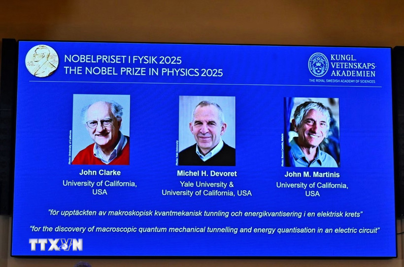 Chiều 7/10 (theo giờ Hà Nội), Viện Hàn lâm Khoa học Hoàng gia Thụy Điển đã xướng tên 3 nhà khoa học thuộc các trường đại học của Mỹ gồm John Clarke, Michel H. Devoret và John M. Martinis là chủ nhân Giải Nobel Vật lý 2025 nhờ phát hiện hiệu ứng đường hầm cơ học lượng tử ở quy mô vĩ mô và lượng tử hóa năng lượng trong mạch điện.