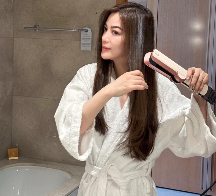 Dyson Airstrait gây ấn tượng bởi trọng lượng nhẹ, chỉ khoảng 700g, tạo cảm giác thoải mái khi thao tác. Thiết bị tích hợp đầu duỗi thông minh cho phép tóc được làm thẳng ngay khi sấy mà không cần dùng thêm máy duỗi truyền thống. Ngoài ra, Trương Ngọc Ánh có thể sử dụng chức năng khóa tay cầm để sấy sơ hoặc tạo độ phồng tự nhiên từ chân tóc, giúp quá trình tạo kiểu trở nên linh hoạt và nhanh chóng.