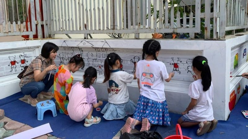 Học sinh vẽ tranh tường làm đẹp khu vực trường học. (Ảnh minh họa: TUỆ KHANH)