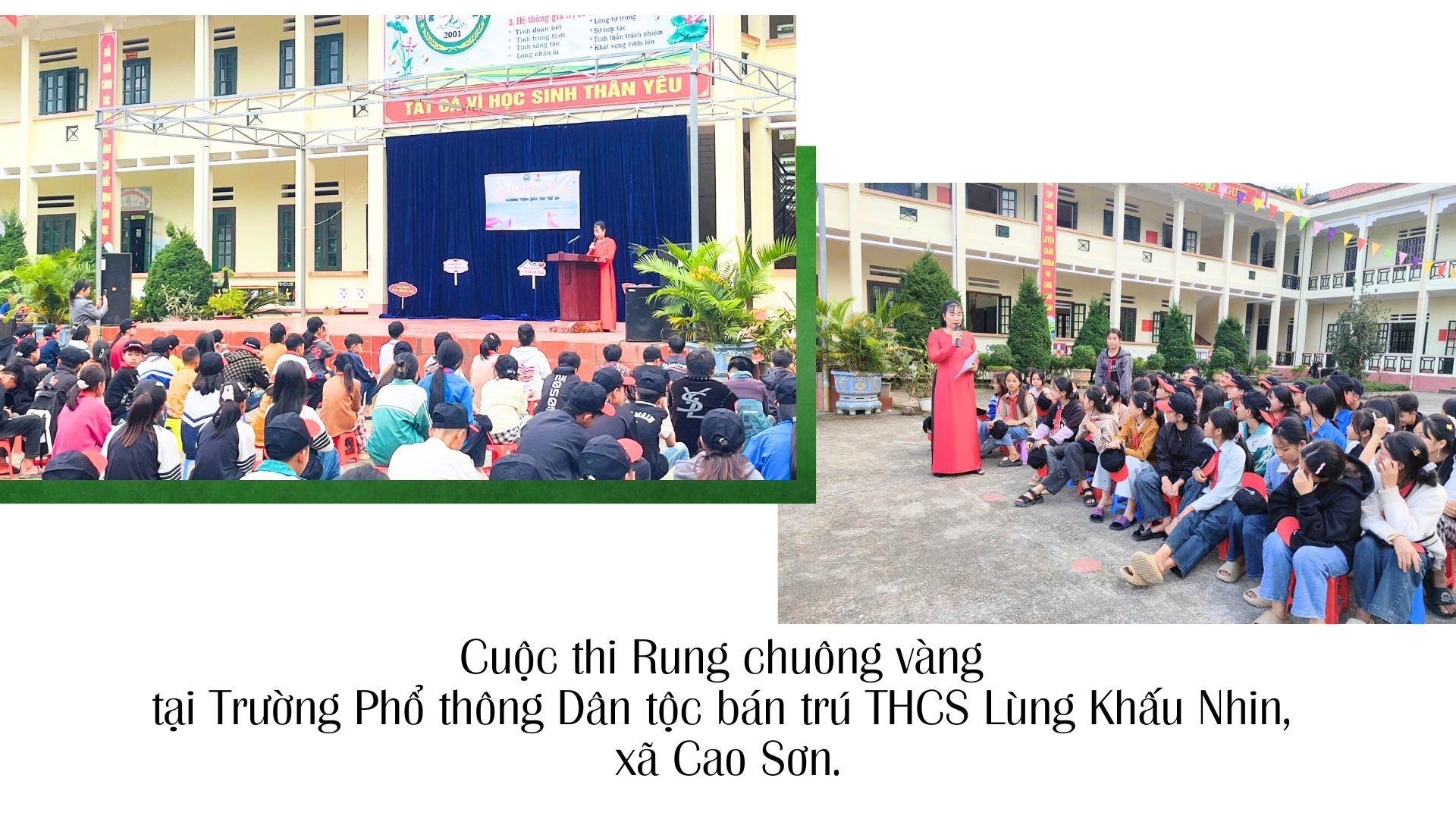 Tại Trường Phổ thông Dân tộc bán trú THCS Lùng Khấu Nhin, xã Cao Sơn, nội dung tuyên truyền được thầy cô khéo léo tổ chức thành cuộc thi “Rung chuông vàng” với chủ đề “Lớn lên cùng ước mơ”. Các câu hỏi trong cuộc thi xoay quanh kiến thức về sức khỏe sinh sản vị thành niên, Luật Hôn nhân và Gia đình, hậu quả của tảo hôn, hôn nhân cận huyết thống và kỹ năng sống lành mạnh.