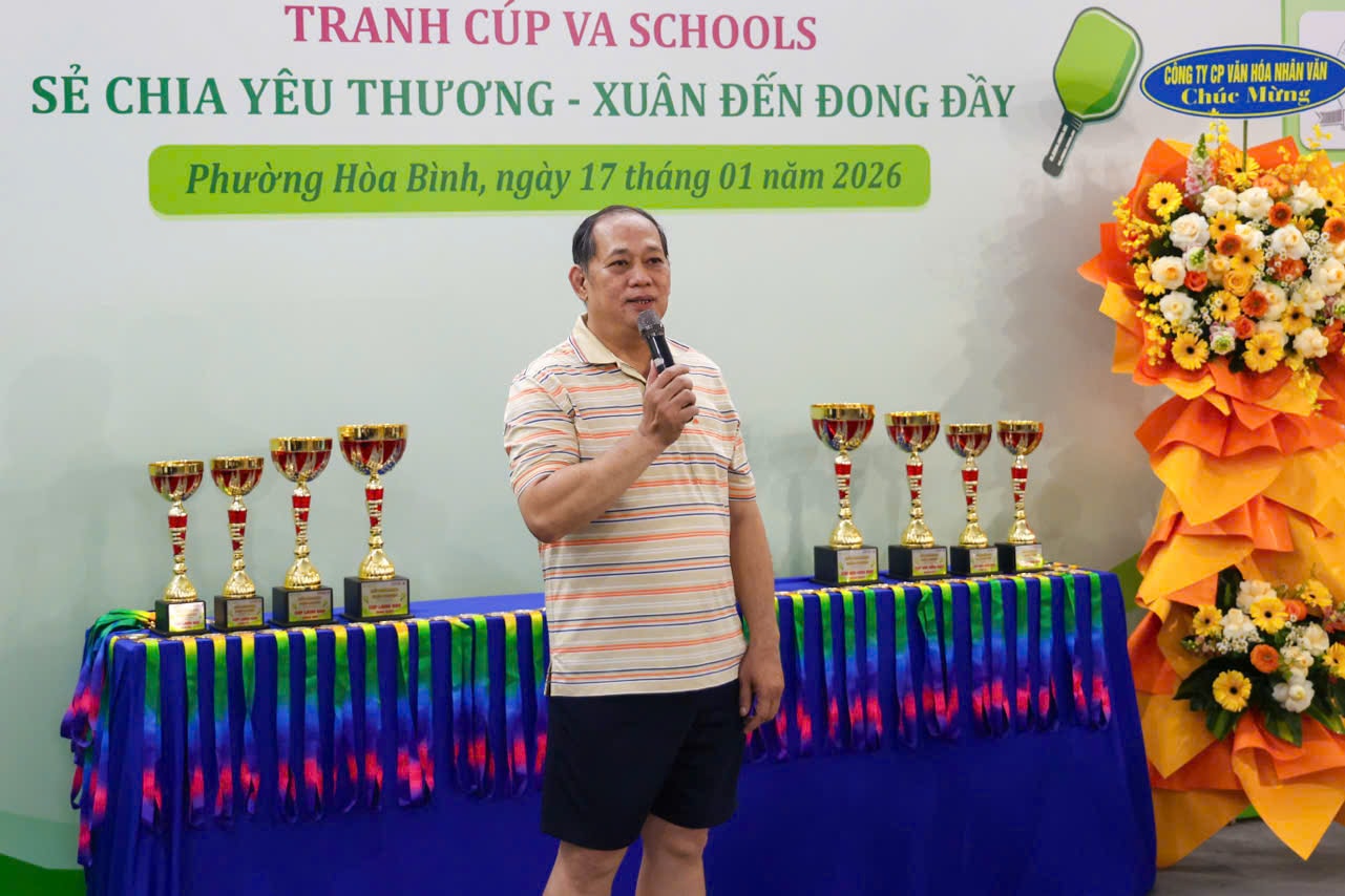 Ông Cao Hoàng Khương - Chủ tịch UBND phường Hòa Bình phát biểu tại lễ khai mạc Giải Pickleball tranh Cúp VA Schools